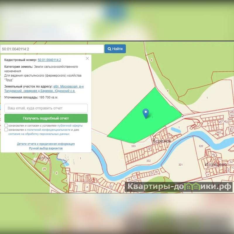 Предлагаю Вам приобрести земельный участок по 2000 соток (20 га), который расположен по адресу: Московская область, Талдомский р-н, Юдинский со, близ деревни Бережок, категория земель – земли сельскохозяйственного назначения, вид разрешенного использования – для ведения крестьянского (фермерского) хозяйства, в собственности физического лица.