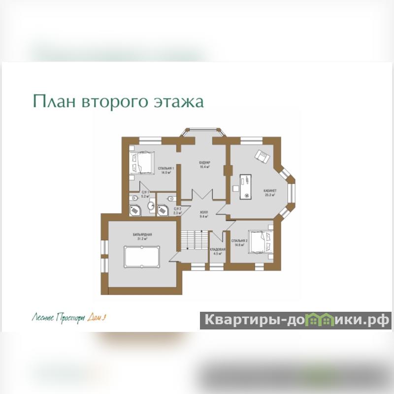 гостиная, санузел, гараж на 2 м/м. Второй этаж: бильярдная, спальня, будуар,