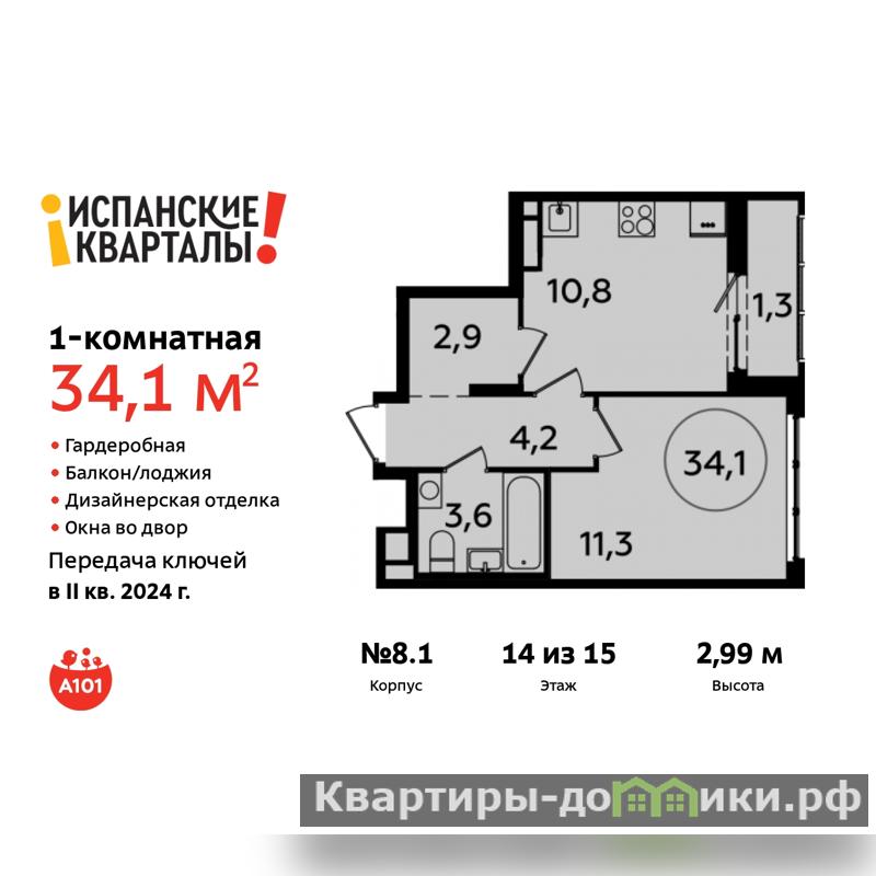 Продается однокомнатная квартира с отделкой в ЖК "Испанские кварталы" на 14 этаже. Общая площадь: 34.1 кв.м., жилая: 11.3 кв.м., площадь просторной кухни-столовой: 10.8 кв.м. Все окна выходят на одну сторону. В квартире одна лоджия, один совмещенный санузел. Высота потолков 2.99 м.