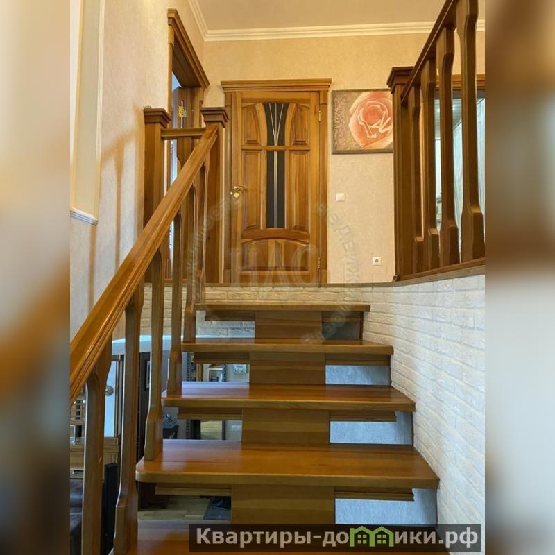 Первый уровень большая гостиная (39,8), кухня-столовая (38,2), санузел (2,3), лоджия (7,2), на втором: холл (18,6), три спальни (28,9, 16,1, 15,8), кладовка (2,7), санузел (5,2).