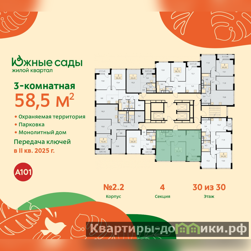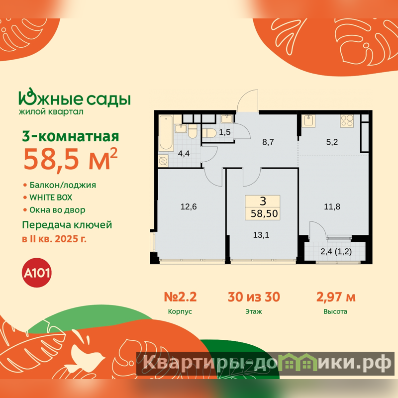 3-комн. квартира с европланировкой и отделкой в ЖК "Южные сады" на 30 этаже. Общая площадь: 58.5 кв.м., жилая: 37.5 кв.м., общая площадь гостиной-столовой с кухонной зоной: 17 кв.м. Европланировка, кухня-гостиная - идеальный вариант для тех, кто любит часто принимать гостей. Комнаты изолированные, все окна выходят на одну сторону. В квартире одна лоджия, один совмещенный и один раздельный санузел. Высота потолков 2.87 м.