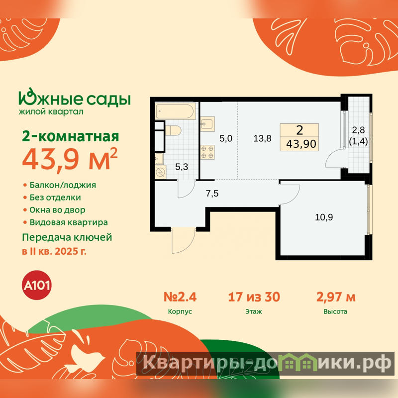 Продается 2-комн. квартира с европланировкой в ЖК "Южные сады" на 17 этаже. Квартира без отделки, после оформления собственности можно делать ремонт. Общая площадь: 43.9 кв.м., жилая: 24.8 кв.м., общая площадь гостиной-столовой с кухонной зоной: 18.9 кв.м. Европланировка, в просторной кухне-гостиной удобно как готовить, так и отдыхать. Комнаты изолированные, все окна выходят на одну сторону. В квартире одна лоджия, один совмещенный санузел. Высота потолков 2.87 м.