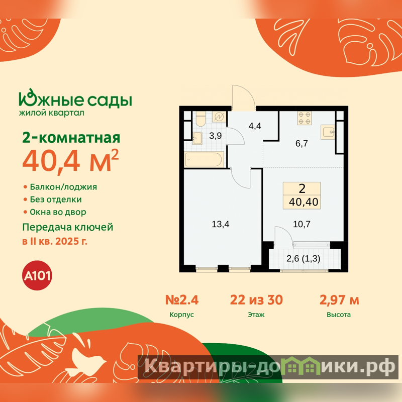 2-комн. квартира с европланировкой от застройщика в ЖК "Южные сады" на 22 этаже. Квартира без отделки, после выдачи ключей можно делать ремонт. Общая площадь: 40.4 кв.м., жилая: 24.1 кв.м., общая площадь гостиной-столовой с кухонной зоной: 17.4 кв.м. Европейская планировка, кухня и гостиная объединены в одно просторное помещение. Комнаты изолированные, все окна выходят на одну сторону. В квартире одна лоджия, один совмещенный санузел. Высота потолков 2.87 м.
