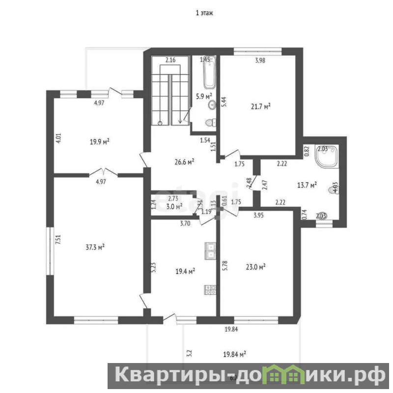 1-й этаж: прихожая 20 кв.м, гостиная 38 кв.м, кухня 19,6 кв.м. Кухня с гостиной объединена аркой. С кухни есть выход на веранду 25 кв.м.; 2 спальни (21 + 22,6), 2 с/у (6 + 13,4).