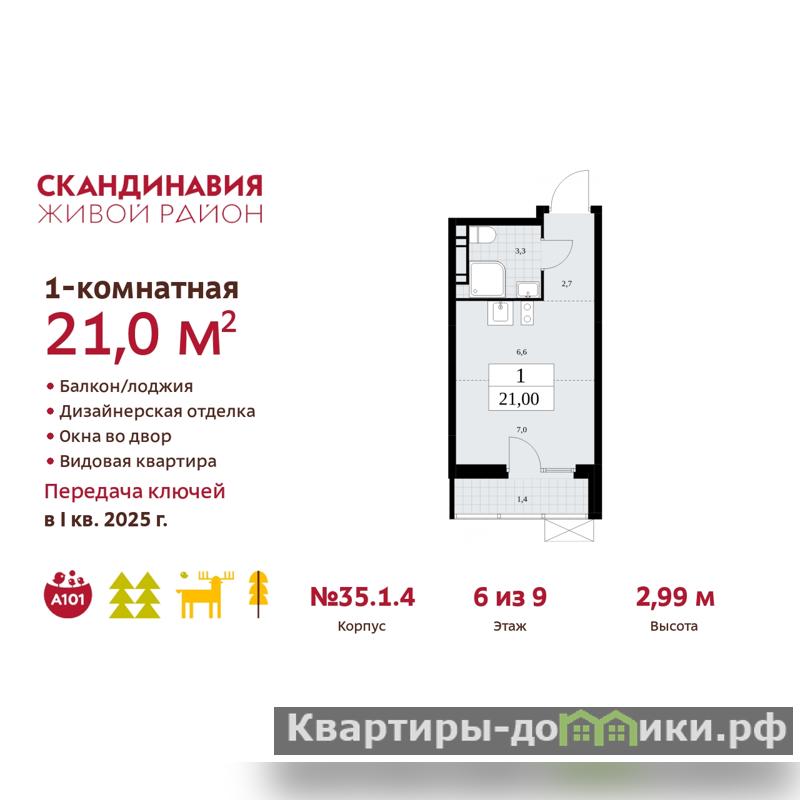 Просторная однокомнатная квартира бизнес-класса-студия с первичной отделкой в ЖК "Скандинавия" на 6 этаже. Общая площадь: 21 кв.м., площадь гостиной 13.6 кв.м., из которых 6.6 кв.м. выделено под кухонную зону. Все окна выходят на одну сторону. В квартире один балкон, один совмещенный санузел. Высота потолков 2.99 м.