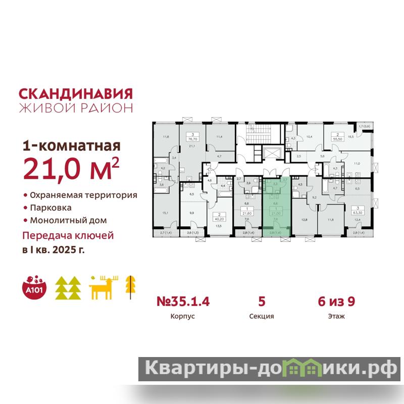 Дом монолитно-блочный, двухподъездный, высотой 9 этажей. Квартира находится в 1-й секции в корпусе бизнес-класса 35.1.4. На этаже 6 квартир. В подъезде 1 пассажирский и 1 грузовой лифт. Начало строительства - 2 квартал 2022 года. Окончание строительства - 4 квартал 2024 года. Оформление сделки по договору долевого участия.