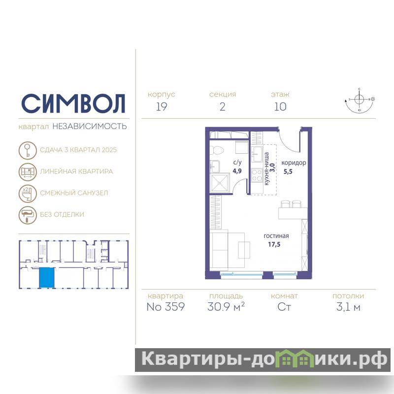 Продаются однокомнатные апартаменты от застройщика в ЖК "Символ" на 10 этаже. Апартаменты без отделки, полностью готова к ремонту. Общая площадь: 30.9 кв.м., жилая: 14.2 кв.м., площадь просторной кухни-столовой: 13.5 кв.м. Все окна выходят на одну сторону. В апартаментах один совмещенный санузел. Высота потолков 3.1 м.
