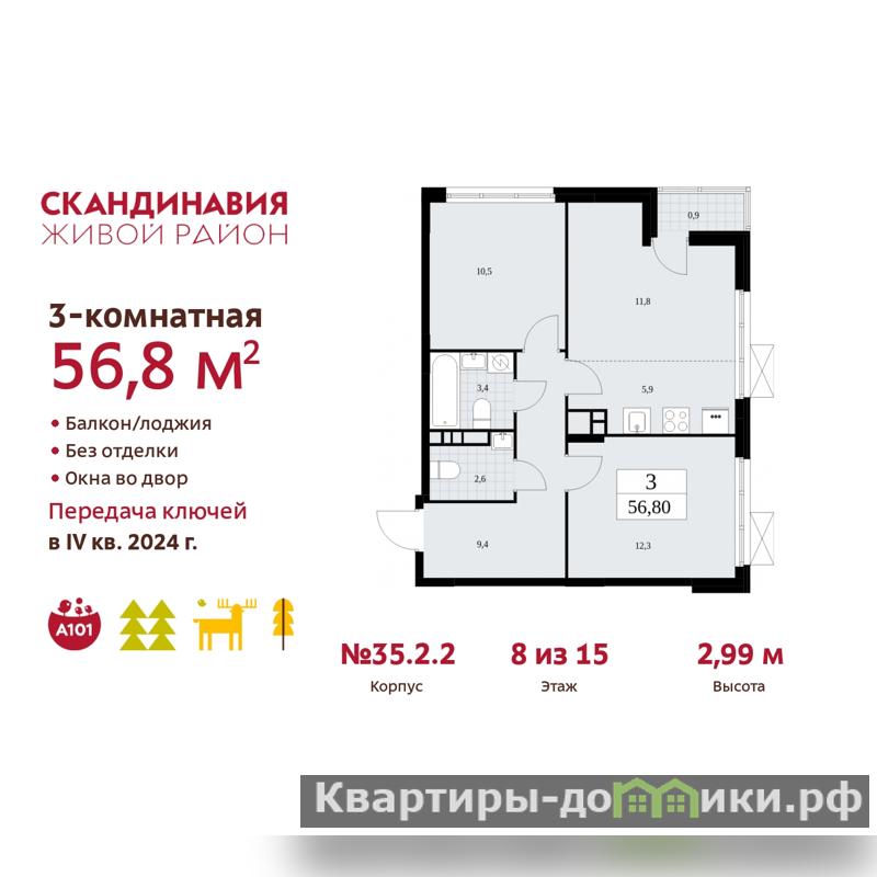 3-комн. квартира с европланировкой в ЖК "Скандинавия" на 8 этаже. Квартира без отделки, после выдачи ключей можно делать ремонт. Общая площадь: 56.8 кв.м., жилая: 34.6 кв.м., общая площадь гостиной-столовой с кухонной зоной: 17.7 кв.м. Европейская планировка, кухня-гостиная - идеальный вариант для тех, кто любит часто принимать гостей. Угловая квартира, идеально подойдет любителям тишины и панорамных видов. В квартире одна лоджия, один совмещенный и один раздельный санузел. Высота потолков 2.99 м.