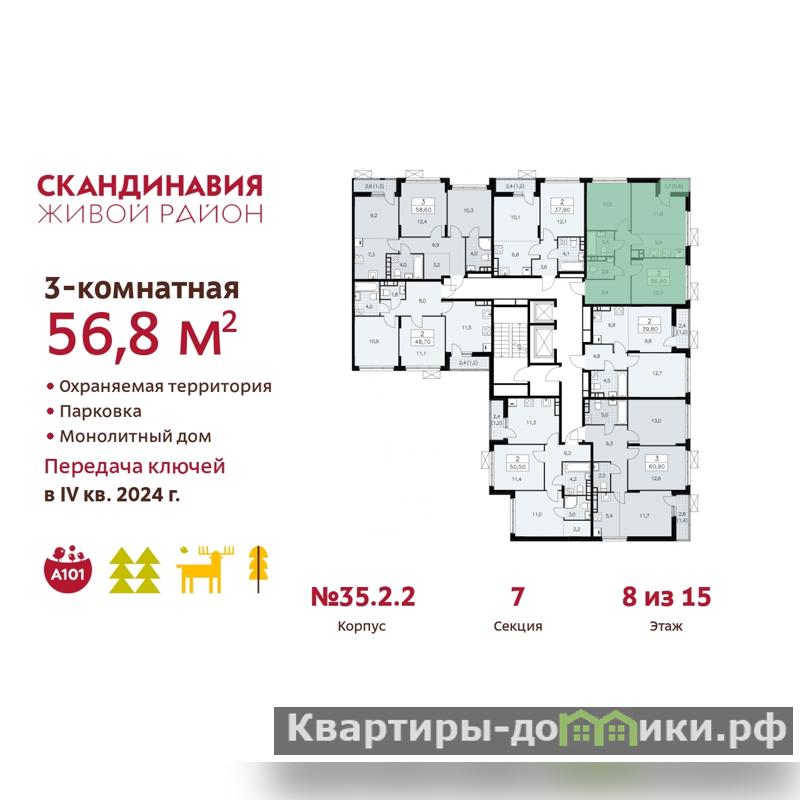 Дом монолитный, черырехподъездный, переменной этажности, от 9 до 15 этажей. Квартира находится в 4-й секции высотой 15 этажей в корпусе 35.2.2. На этаже 5 квартир. В подъезде 1 пассажирский и 1 грузовой лифт. Начало строительства - 3 квартал 2022 года. Окончание строительства - 4 квартал 2024 года. Оформление сделки по договору долевого участия.