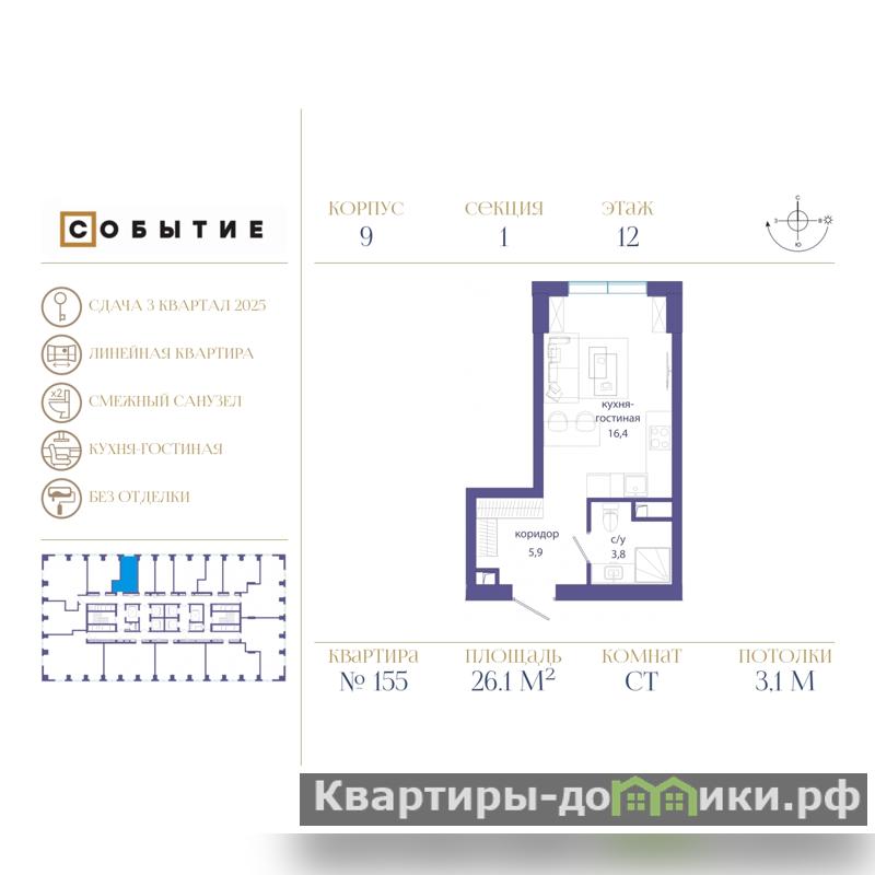 Продается 1-комн. квартира-студия в ЖК "Событие" на 12 этаже. Квартира без отделки, после выдачи ключей можно делать ремонт. Общая площадь: 26.1 кв.м., площадь гостиной 16.9 кв.м., из которых 5 кв.м. выделено под кухонную зону. Все окна выходят на одну сторону. В квартире один совмещенный санузел. Высота потолков 3.1 м.