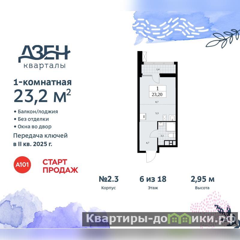 Однокомнатная квартира-студия в ЖК "Дзен-кварталы" на 6 этаже. Квартира без отделки, после оформления собственности можно делать ремонт. Общая площадь: 23.2 кв.м., площадь гостиной 15.1 кв.м., из которых 5.6 кв.м. выделено под кухонную зону. Все окна выходят на одну сторону. В квартире один балкон, один совмещенный санузел. Высота потолков 2.87 м.