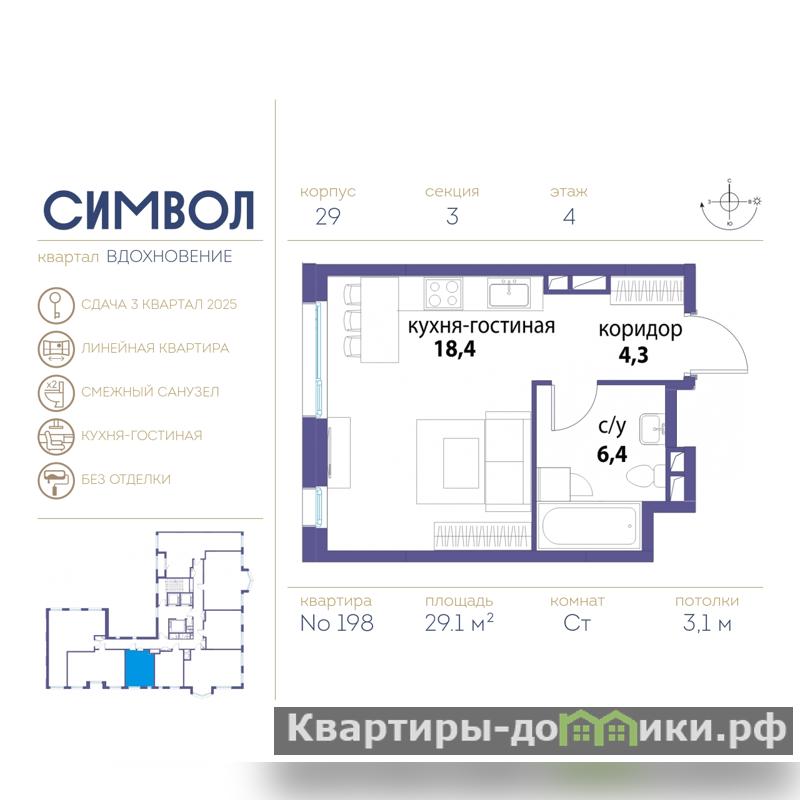 Однокомнатная квартира-студия от застройщика в ЖК "Символ" на 4 этаже. Квартира без отделки, новый владелец может сделать ремонт по индивидуальному дизайн-проекту. Общая площадь: 29.1 кв.м., площадь гостиной 18.4 кв.м., из которых 5 кв.м. выделено под кухонную зону. Все окна выходят на одну сторону. В квартире один совмещенный санузел. Высота потолков 3.1 м.