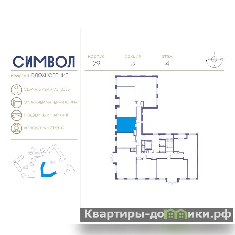 Дом монолитный, черырехподъездный, переменной этажности, от 11 до 26 этажей. Квартира находится в 3-й секции высотой 11 этажей в корпусе 29 (квартал "Вдохновение"). На этаже 9 квартир. В подъезде 1 пассажирский лифт. Начало строительства - 2 квартал 2022 года. Окончание строительства - 3 квартал 2025 года. Оформление сделки по договору долевого участия.