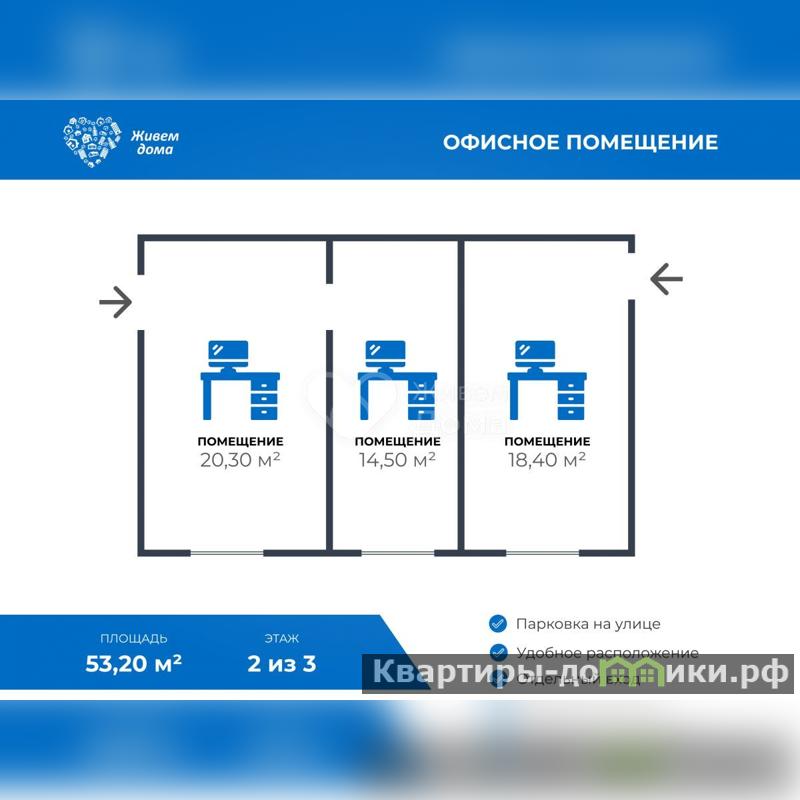 Есть 3 кабинета: 20.3, 14.5, 18.4 кв.м.