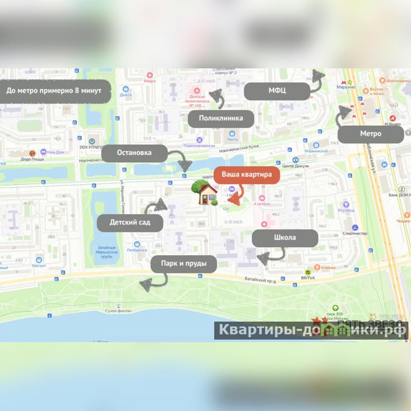 * Дом находится в ликвидном и тихом районе города Москва. В шаговой доступности располагаются школа, детский сад, салоны красоты, парк 850-летия Москвы с выходом к реке для прогулок и отдыха, поликлиника, супермаркеты на любой вкус, банки и банкоматы. Зеленый благоустроенный двор, с современной детской площадкой. В пешей доступности находится также сквер, в котором Вы сможете насладиться прогулками на свежем воздухе! До станции метро Марьино 8 минут пешком.