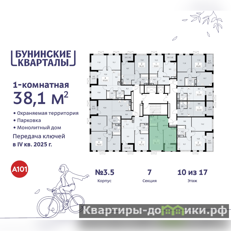 Продается 1-комн. квартира с первичной отделкой в ЖК "Бунинские кварталы" на 10 этаже. Общая площадь: 38.1 кв.м., жилая: 15.6 кв.м., площадь просторной кухни-столовой: 10.3 кв.м. Все окна выходят на одну сторону. В квартире одна лоджия, один совмещенный санузел. Высота потолков 2.95 м.