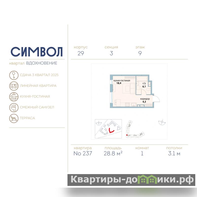 Продается 1-комн. квартира-студия от застройщика в ЖК "Символ" на 9 этаже. Квартира без отделки, после оформления собственности можно делать ремонт. Общая площадь: 28.8 кв.м., площадь гостиной 18.4 кв.м., из которых 5 кв.м. выделено под кухонную зону. Все окна выходят на одну сторону. В квартире один совмещенный санузел. Высота потолков 3.1 м.
