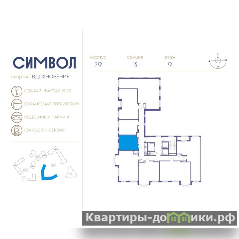 Дом монолитный, черырехподъездный, переменной этажности, от 11 до 26 этажей. Квартира находится в 3-й секции высотой 11 этажей в корпусе 29 (квартал "Вдохновение"). На этаже 9 квартир. В подъезде 1 пассажирский лифт. Начало строительства - 2 квартал 2022 года. Окончание строительства - 3 квартал 2025 года. Оформление сделки по договору долевого участия.