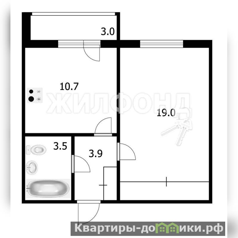 Жилая комната - 19 кв.м. , кухня - 10,7 кв.м. , коридор - 3,9 кв.м. , с. у - 3, 5 кв.м. , лоджия - 3,0 кв.м.
