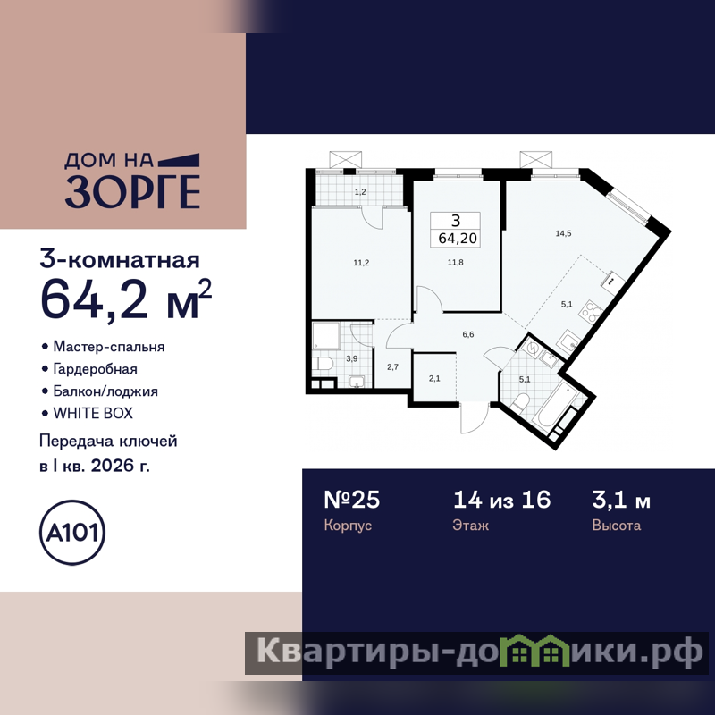 Просторная 3-комн. квартира с европланировкой и предчистовой отделкой в ЖК "Дом на Зорге" на 14 этаже. Общая площадь: 64.2 кв.м., жилая: 37.5 кв.м., суммарная площадь гостиной-столовой с кухонной зоной: 19.6 кв.м. Европланировка, кухня-гостиная - идеальный вариант для тех, кто любит часто принимать гостей. Угловая квартира, очень светлая, естественная вентиляция при открытии окон. В квартире одна лоджия, два совмещенных санузла. Высота потолков 3.1 м.
