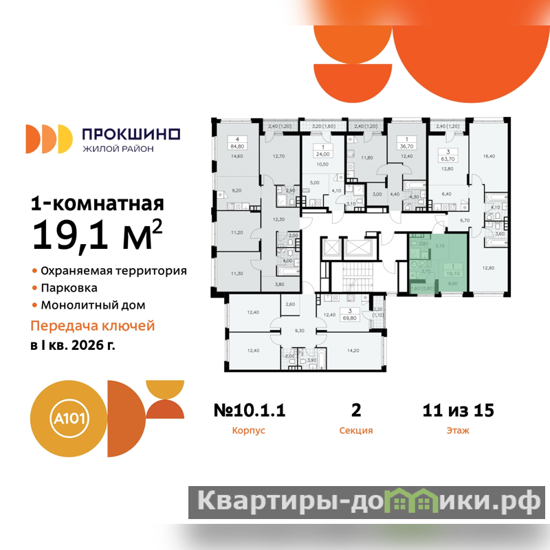 Однокомнатная квартира-студия в ЖК "Прокшино" на 11 этаже. Квартира без отделки, после выдачи ключей можно делать ремонт. Общая площадь: 19.1 кв.м., площадь гостиной 12.6 кв.м., из которых 3.7 кв.м. выделено под кухонную зону. Все окна выходят на одну сторону. В квартире одна лоджия, один совмещенный санузел. Высота потолков 2.99 м.