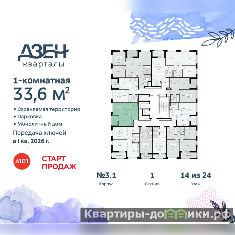 Продается 1-комн. квартира от застройщика в ЖК "Дзен-кварталы" на 14 этаже. Квартира без отделки, полностью готова к ремонту. Общая площадь: 33.6 кв.м., жилая: 12.8 кв.м., площадь кухни: 8.9 кв.м. Все окна выходят на одну сторону. В квартире одна лоджия, один совмещенный санузел. Высота потолков 2.95 м.