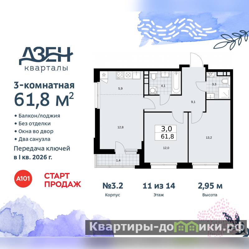 Просторная трехкомнатная квартира с европланировкой в ЖК "Дзен-кварталы" на 11 этаже. Квартира без отделки, полностью готова к ремонту. Общая площадь: 61.8 кв.м., жилая: 38 кв.м., суммарная площадь гостиной-столовой с кухонной зоной: 18.7 кв.м. Европланировка, кухня и гостиная объединены в одно просторное помещение. Квартира угловая, очень светлая, естественная вентиляция при открытии окон. В квартире одна лоджия, два совмещенных санузла. Высота потолков 2.95 м.