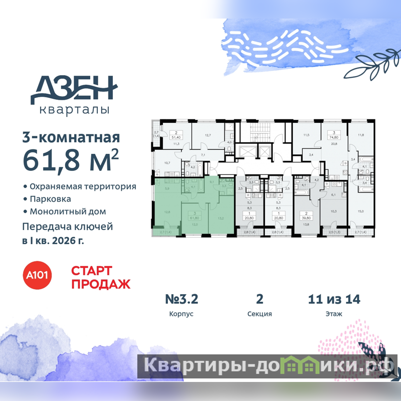 Дом монолитный, многоподъездный, переменной этажности, от 9 до 14 этажей. Квартира находится в 1-й секции высотой 12 этажей в корпусе 3.2. На этаже 6 квартир. В подъезде 1 пассажирский и 1 грузовой лифт. Начало строительства - 3 квартал 2023 года. Окончание строительства - 1 квартал 2026 года. Оформление сделки по договору долевого участия.
