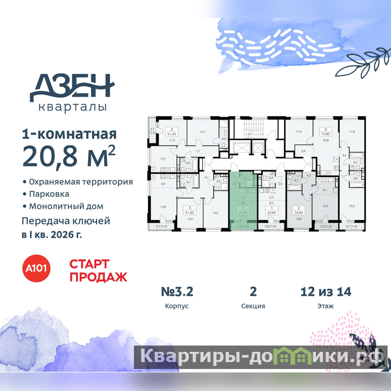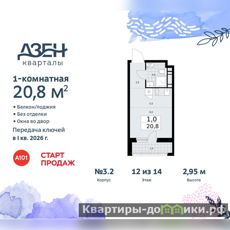 Однокомнатная квартира-студия от застройщика в ЖК "Дзен-кварталы" на 12 этаже. Квартира без отделки, новый владелец может сделать ремонт по индивидуальному дизайн-проекту. Общая площадь: 20.8 кв.м., площадь гостиной 13.7 кв.м., из которых 5.3 кв.м. выделено под кухонную зону. Все окна выходят на одну сторону. В квартире один балкон, один совмещенный санузел. Высота потолков 2.95 м.