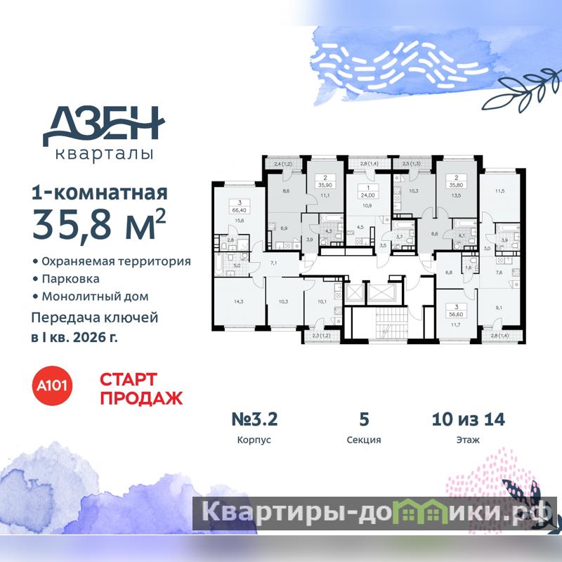 Просторная 1-комн. квартира в ЖК "Дзен-кварталы" на 10 этаже. Квартира без отделки, после оформления собственности можно делать ремонт. Общая площадь: 35.8 кв.м., жилая: 13.5 кв.м., площадь просторной кухни-столовой: 10.3 кв.м. Все окна выходят на одну сторону. В квартире одна лоджия, один совмещенный санузел. Высота потолков 2.95 м.