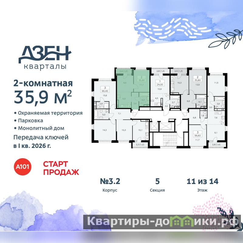 Дом монолитный, многоподъездный, переменной этажности, от 9 до 14 этажей. Квартира находится в 4-й секции высотой 12 этажей в корпусе 3.2. На этаже 5 квартир. В подъезде 1 пассажирский и 1 грузовой лифт. Начало строительства - 3 квартал 2023 года. Окончание строительства - 1 квартал 2026 года. Оформление сделки по договору долевого участия.