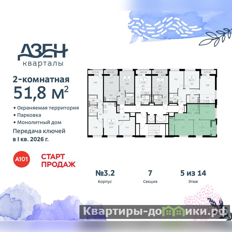 2-комн. квартира от застройщика в ЖК "Дзен-кварталы" на 5 этаже. Квартира без отделки, новый владелец может сделать ремонт по индивидуальному проекту. Общая площадь: 51.8 кв.м., жилая: 24 кв.м., площадь просторной кухни-столовой: 10.7 кв.м. Угловая квартира, окна oбecпeчивaют paвнoмepнoe ocвeщeниe в тeчeниe дня. В квартире одна лоджия, два совмещенных санузла. Высота потолков 2.95 м.