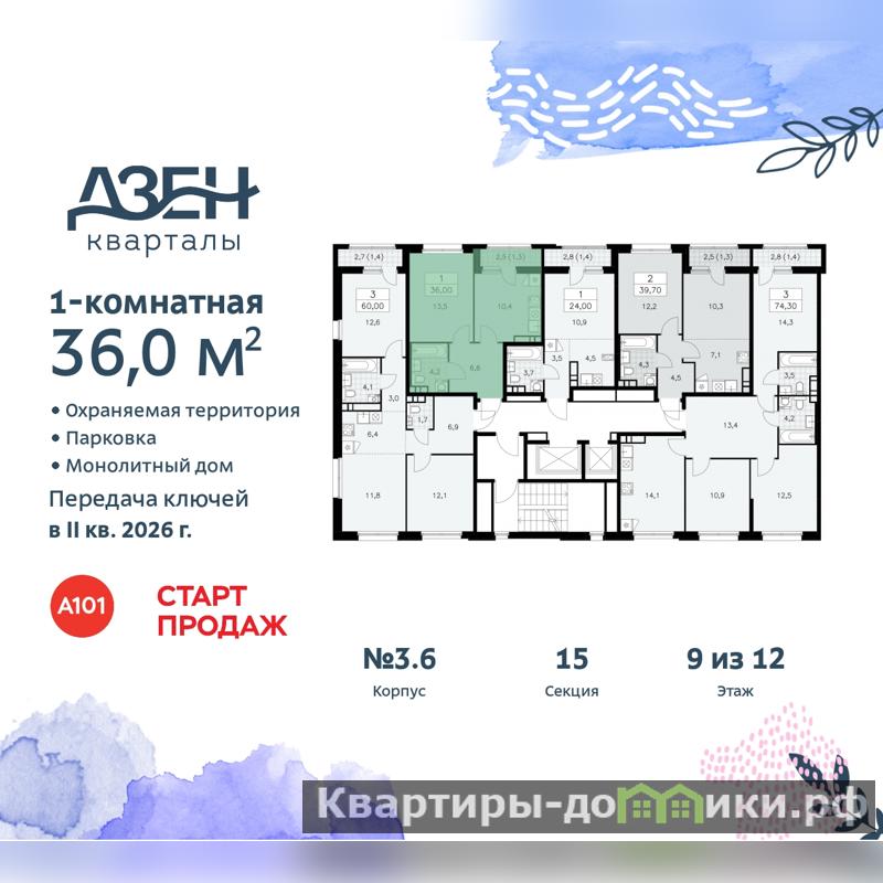Дом монолитный, черырехподъездный, переменной этажности, от 9 до 12 этажей. Квартира находится в 1-й секции высотой 12 этажей в корпусе 3.6. На этаже 5 квартир. В подъезде 1 пассажирский и 1 грузовой лифт. Начало строительства - 3 квартал 2023 года. Окончание строительства - 2 квартал 2026 года. Оформление сделки по договору долевого участия.
