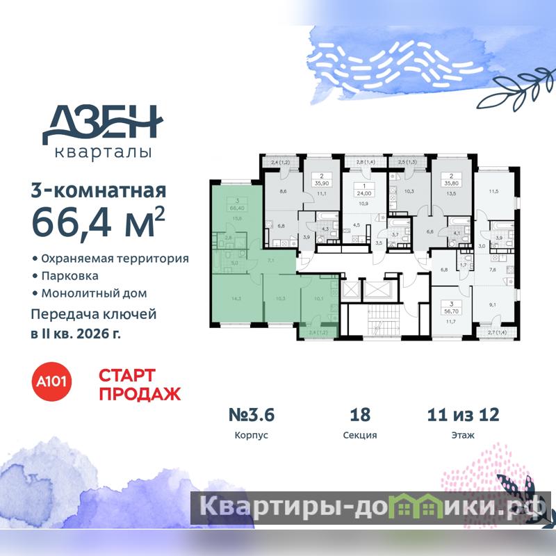 Просторная трехкомнатная квартира с первичной отделкой в ЖК "Дзен-кварталы" на 11 этаже. Общая площадь: 66.4 кв.м., жилая: 40.2 кв.м., площадь просторной кухни-столовой: 10.1 кв.м. Квартира - распашонка, без проходных комнат, окна выходят на paзные стороны дома. В квартире один балкон, два совмещенных санузла. Высота потолков 2.95 м.