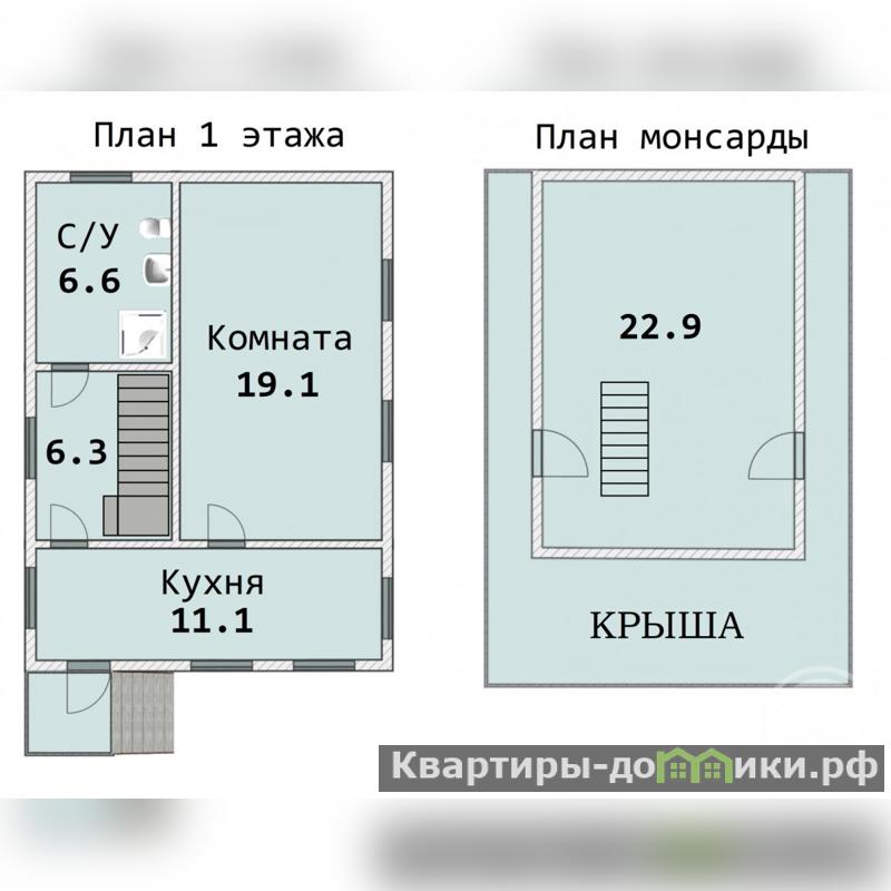 Общая площадь дома 66 кв.м., жилая 41,2 кв.м., площадь кухни 11,1 кв.м. На первом этаже расположены прихожая, совмещенный санузел, кухня и комната, разделенная перегородкой c раздвижной дверью на спальню и столовую зону. На втором мансардном этаже - одна большая комната.
