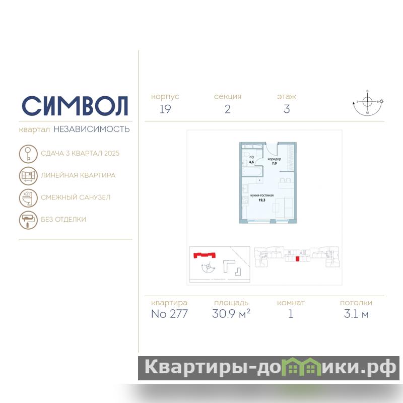 Однокомнатные апартаменты от застройщика в ЖК "Символ" на 3 этаже. Апартаменты без отделки, новый собственник может сделать ремонт по своему дизайн-проекту. Общая площадь: 30.9 кв.м., жилая: 14.2 кв.м., площадь просторной кухни-столовой: 13.5 кв.м. Все окна выходят на одну сторону. В апартаментах один совмещенный санузел. Высота потолков 3.1 м.