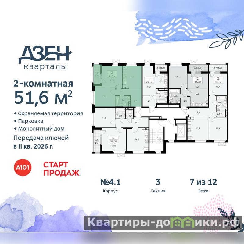 Продается 2-комн. квартира бизнес-класса от застройщика с отделкой в ЖК "Дзен-кварталы" на 7 этаже. Общая площадь: 51.6 кв.м., жилая: 24.3 кв.м., площадь просторной кухни-столовой: 12.3 кв.м. Квартира угловая, идеально подойдет любителям тишины и панорамных видов. В квартире одна лоджия, один совмещенный санузел. Высота потолков 3.1 м.