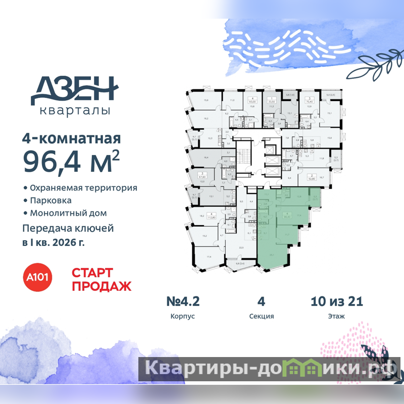Четырехкомнатная квартира бизнес-класса с европланировкой в ЖК "Дзен-кварталы" на 10 этаже. Квартира без отделки, новый владелец может сделать ремонт по своему дизайн-проекту. Общая площадь: 96.4 кв.м., жилая: 66.6 кв.м., суммарная площадь гостиной-столовой с кухонной зоной: 30 кв.м. Европейская планировка, зона гостиной комнаты объединена с кухней. Квартира угловая, очень светлая, естественная вентиляция при открытии окон. В квартире один балкон, два совмещенных и один раздельный санузел. Высота потолков 3.1 м.