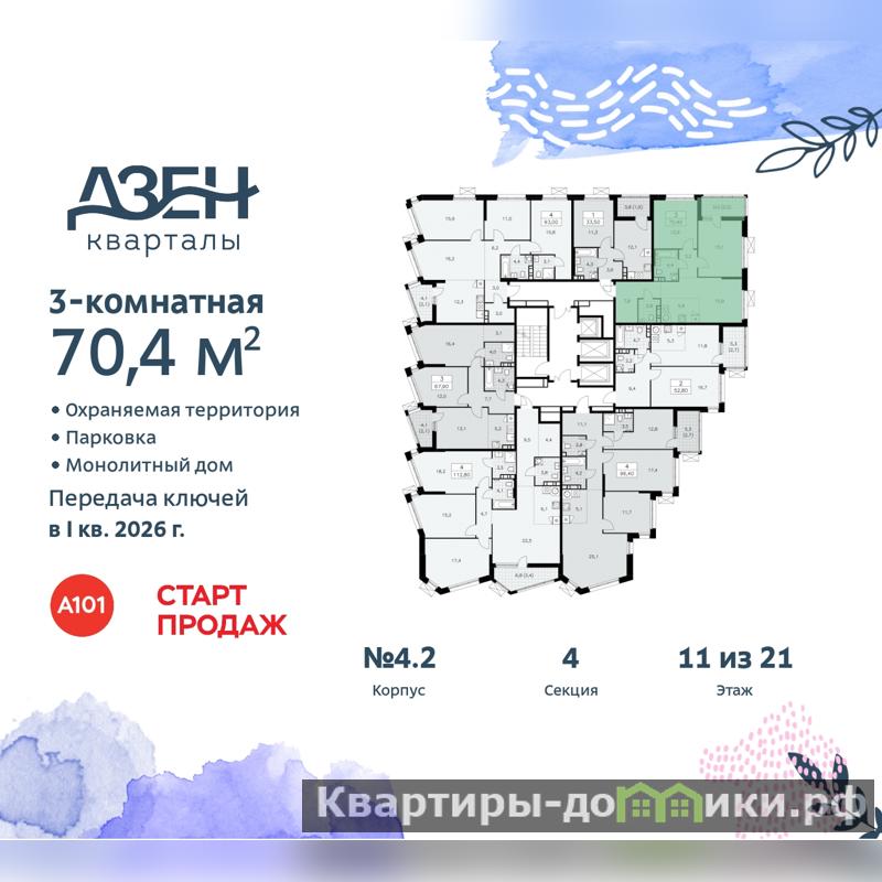 3-комн. квартира бизнес-класса с европланировкой от застройщика в ЖК "Дзен-кварталы" на 11 этаже. Квартира без отделки, после оформления собственности можно делать ремонт. Общая площадь: 70.4 кв.м., жилая: 43.9 кв.м., общая площадь гостиной-столовой с кухонной зоной: 21.7 кв.м. Европланировка, площадь комнат позволяет разместить в них все необходимое, а в просторной кухне-гостиной удобно как готовить, так и отдыхать. Угловая квартира, идеально подойдет любителям тишины и панорамных видов. В квартире одна лоджия, один совмещенный и один раздельный санузел. Высота потолков 3.1 м.