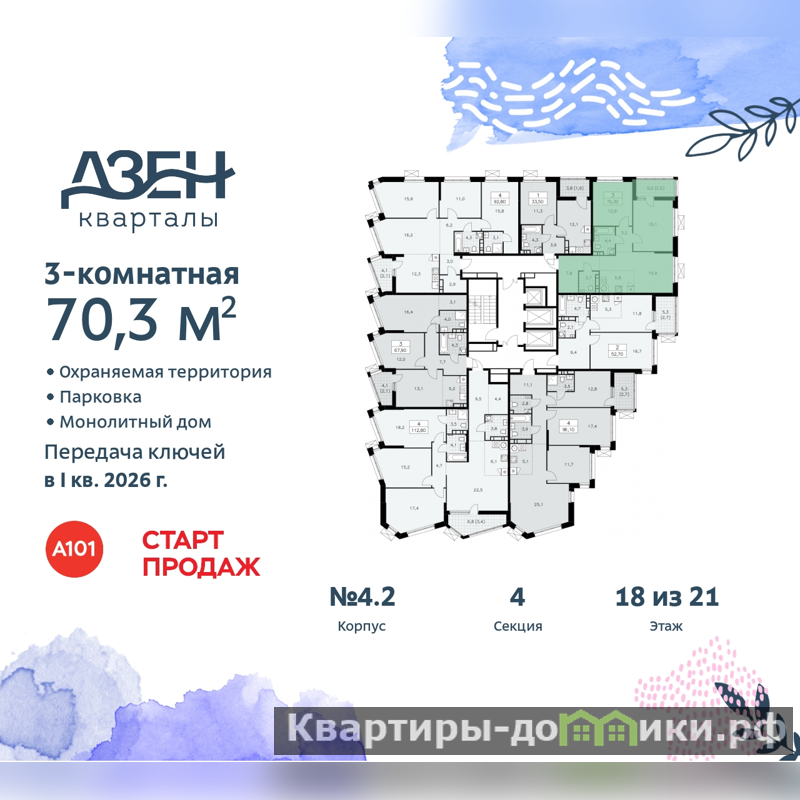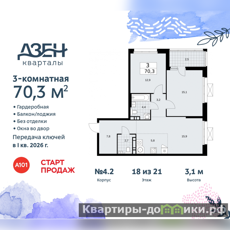 Продается 3-комн. квартира бизнес-класса с европланировкой от застройщика в ЖК "Дзен-кварталы" на 18 этаже. Квартира без отделки, новый владелец может сделать ремонт по своему проекту. Общая площадь: 70.3 кв.м., жилая: 43.9 кв.м., общая площадь гостиной-столовой с кухонной зоной: 21.7 кв.м. Европейская планировка, за счет большой площади кухни-гостиной квартира выглядит просторной и очень удобна для жизни. Угловая квартира, очень светлая, естественная вентиляция при открытии окон. В квартире одна лоджия, один совмещенный и один раздельный санузел. Высота потолков 3.1 м.