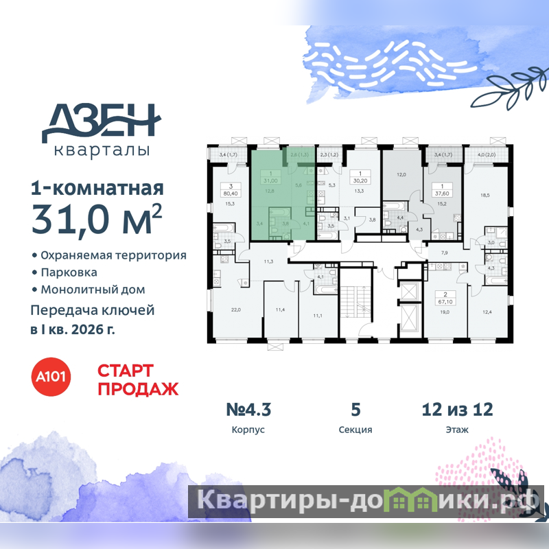 Дом монолитный, черырехподъездный, переменной этажности, от 8 до 12 этажей. Квартира находится в 1-й секции высотой 12 этажей в корпусе бизнес-класса 4.3. На этаже 5 квартир. В подъезде 1 пассажирский и 1 грузовой лифт. Начало строительства - 3 квартал 2023 года. Окончание строительства - 1 квартал 2026 года. Оформление сделки по договору долевого участия.