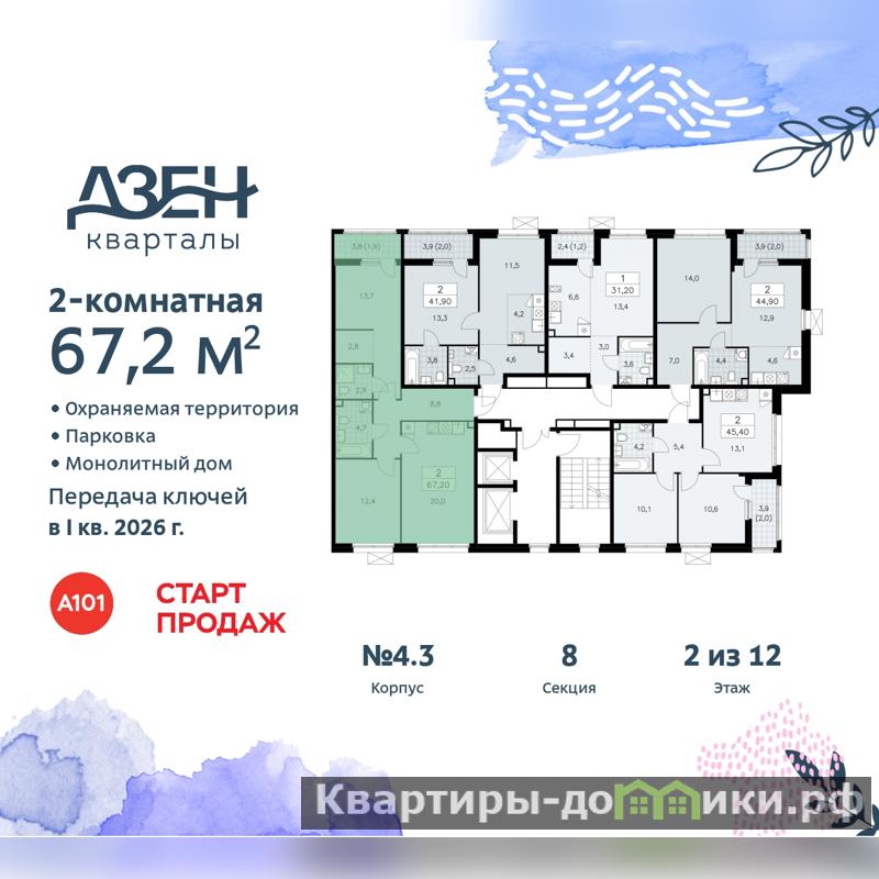 2-комн. квартира бизнес-класса от застройщика в ЖК "Дзен-кварталы" на 2 этаже. Квартира без отделки, полностью готова к чистовой отделке и дальнейшему ремонту. Общая площадь: 67.2 кв.м., жилая: 26.1 кв.м., площадь просторной кухни-столовой: 20 кв.м. Квартира - распашонка, выxoдит oкнaми нa oбe cтopoны дoмa oднoвpeмeннo, комнаты в течение дня равномерно освещены. В квартире один балкон, два совмещенных санузла. Высота потолков 3.1 м.