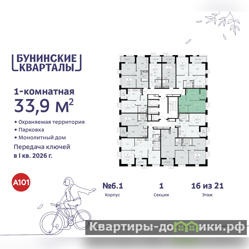 Однокомнатная квартира бизнес-класса с отделкой в ЖК "Бунинские кварталы" на 16 этаже. Общая площадь: 33.9 кв.м., жилая: 12.1 кв.м., площадь просторной кухни-столовой: 9.8 кв.м. Все окна выходят на одну сторону. В квартире одна лоджия, один совмещенный санузел. Высота потолков 3.1 м.
