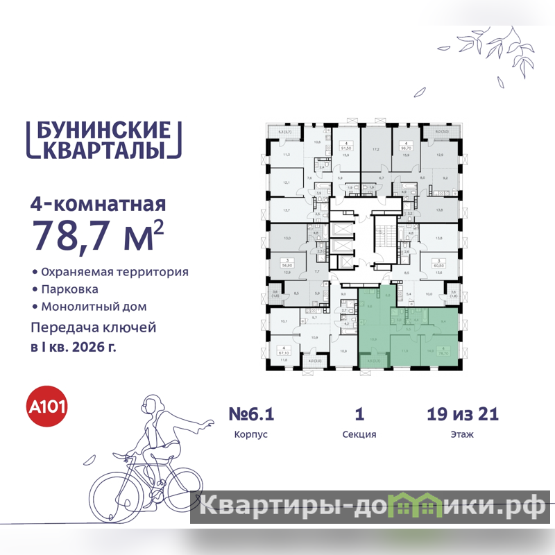 Продается четырехкомнатная квартира бизнес-класса с европланировкой и предчистовой отделкой в ЖК "Бунинские кварталы" на 19 этаже. Общая площадь: 78.7 кв.м., жилая: 47 кв.м., суммарная площадь гостиной-столовой с кухонной зоной: 20.6 кв.м. Европланировка, зона гостиной комнаты объединена с кухней. Угловая квартира, идеально подойдет любителям тишины и панорамных видов. В квартире одна лоджия, два совмещенных санузла. Высота потолков 3.1 м.