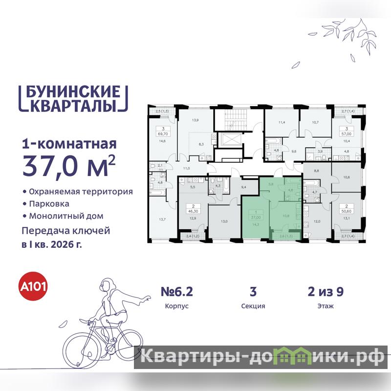 1-комн. квартира бизнес-класса с отделкой в ЖК "Бунинские кварталы" на 2 этаже. Общая площадь: 37 кв.м., жилая: 14.3 кв.м., площадь просторной кухни-столовой: 10.8 кв.м. Все окна выходят на одну сторону. В квартире одна лоджия, один совмещенный санузел. Высота потолков 3.1 м.