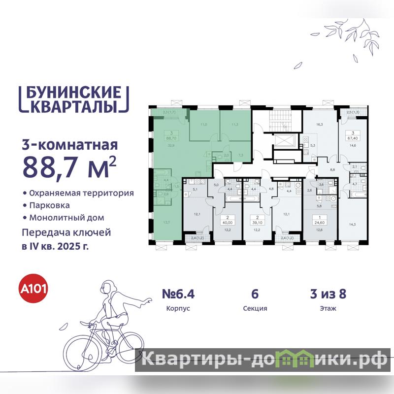 3-комн. квартира бизнес-класса в ЖК "Бунинские кварталы" на 3 этаже. Квартира без отделки, новый владелец может сделать ремонт по индивидуальному проекту. Общая площадь: 88.7 кв.м., жилая: 36 кв.м., площадь просторной кухни-столовой: 32.9 кв.м. Квартира без проходных комнат, окна выходят нa три cтopoны дома. В квартире одна лоджия, два совмещенных и один раздельный санузел. Высота потолков 3.1 м.
