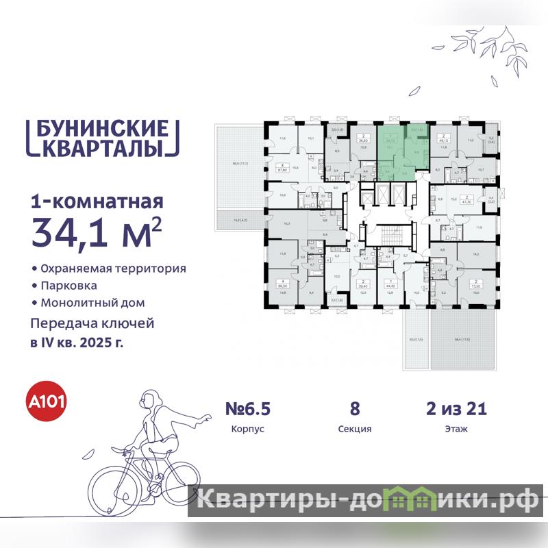 Продается однокомнатная квартира бизнес-класса в ЖК "Бунинские кварталы" на 2 этаже. Квартира без отделки, новый собственник может сделать ремонт по индивидуальному дизайн-проекту. Общая площадь: 34.1 кв.м., жилая: 12.1 кв.м., площадь просторной кухни-столовой: 9.9 кв.м. Все окна выходят на одну сторону. В квартире одна лоджия, один совмещенный санузел. Высота потолков 3.1 м.