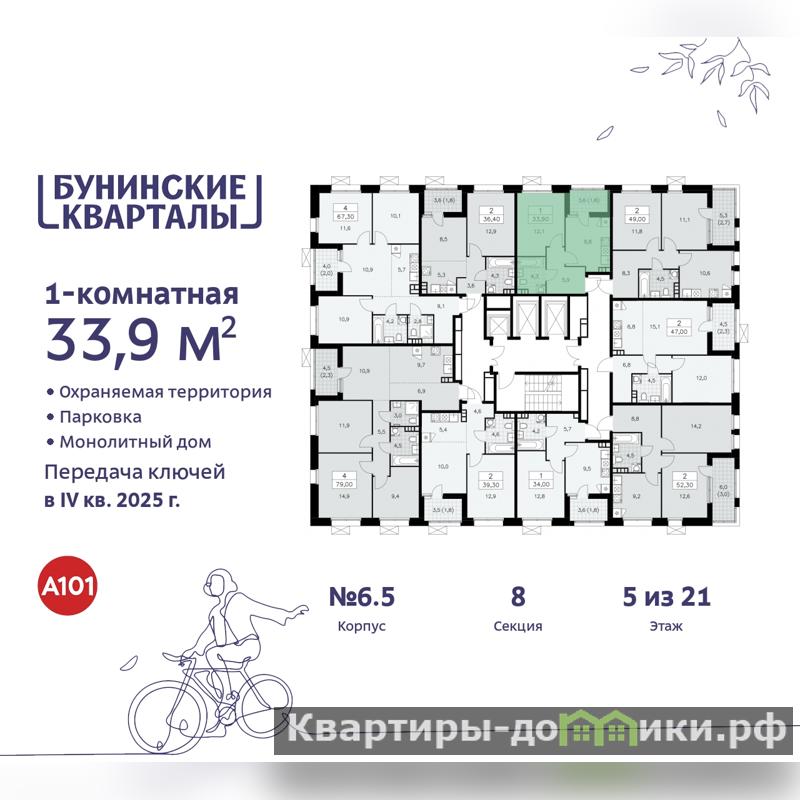 1-комн. квартира бизнес-класса в ЖК "Бунинские кварталы" на 5 этаже. Квартира без отделки, полностью готова к ремонту. Общая площадь: 33.9 кв.м., жилая: 12.1 кв.м., площадь просторной кухни-столовой: 9.8 кв.м. Все окна выходят на одну сторону. В квартире одна лоджия, один совмещенный санузел. Высота потолков 3.1 м.