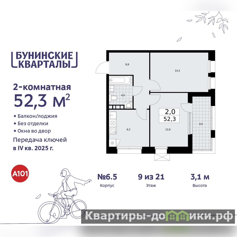 2-комн. квартира бизнес-класса в ЖК "Бунинские кварталы" на 9 этаже. Квартира без отделки, полностью готова к ремонту. Общая площадь: 52.3 кв.м., жилая: 26.7 кв.м., площадь просторной кухни-столовой: 9.2 кв.м. Угловая квартира, очень светлая, естественная вентиляция при открытии окон. В квартире одна лоджия, один совмещенный санузел. Высота потолков 3.1 м.