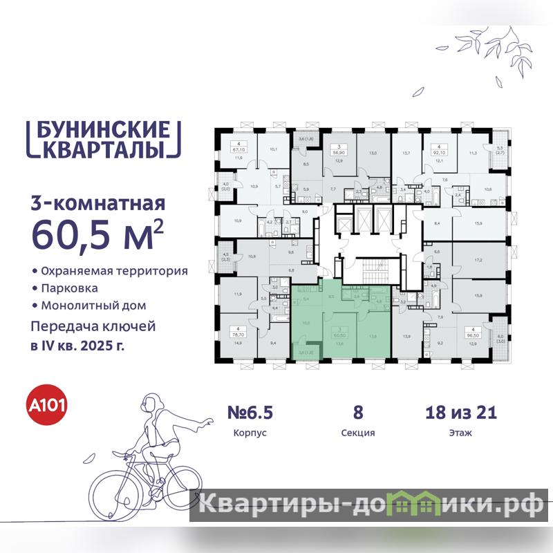 Просторная 3-комн. квартира бизнес-класса с европланировкой в ЖК "Бунинские кварталы" на 18 этаже. Квартира без отделки, после получения ключей можно делать ремонт. Общая площадь: 60.5 кв.м., жилая: 37.4 кв.м., общая площадь гостиной-столовой с кухонной зоной: 15.4 кв.м. Европейская планировка, кухня и гостиная объединены в одно просторное помещение. Комнаты изолированные, все окна выходят на одну сторону. В квартире одна лоджия, два совмещенных санузла. Высота потолков 3.1 м.
